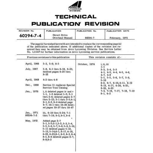 This 93 pages Overhaul Manual in Pdf Download for the 1974 Avco Lycoming Direct Drive Engine Part Number 60294-7-4.